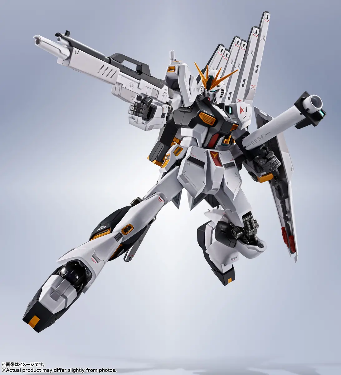 Amuro Ray's final mobile suit, the Nu Gundam, finally joins the "Metal Robot Spirits" action-figure series from Bandai! In addition to the Nu Gundam's standard equipment, the set includes a variety of effect parts so you can recreate famous scenes from the series! The Nu Gundam's distinctive monotone coloring and level of detail, even on the soles of its feet and the underside of its shield, are faithfully recreated to the original design. It's fully equipped, too, with its eye-catching fin funnels. Die-cast parts are used primarily for the joints; stable posing is possible even with the fin funnels equipped, which are balanced differently on the left and right. The beam rifle is included, and Amuro's personal mark is reproduced on the shield. The New Hyper Bazooka can be held in the hand, or mounted on the back; the fin funnels can be displayed in a firing position using special joints and effect parts. In addition to the standard part, the Beam Saber's beam blade comes with two different parts for recreating scenes -- one is used for the side slash shown in the battle against the Sazabi. A special support is also included to display it in a stable pose. Order this outstanding mech for your own collection today!