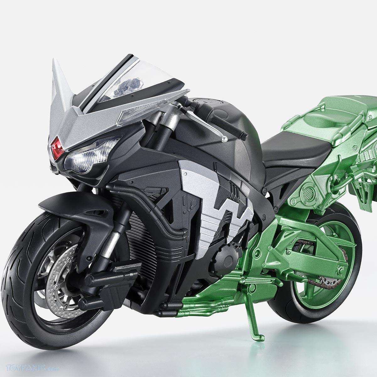 The rear back unit features metallic green coloring with different brightness levels for the top and bottom parts. Additionally, the exhaust pipe and license plate areas have been given a darker green color than the rest of the body. The license plate also recreates the "Fuuto Number" that you can see in the anime.