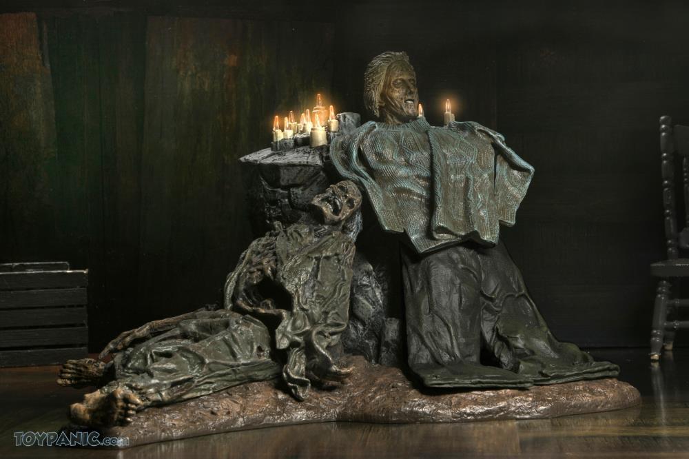 This diorama is in scale and compatible with NECA’s 7-inch scale action figures (sold separately). It includes a cardboard backdrop for display and LED light-up candles that flicker for extra eeriness. (Requires 2 AAA Batteries—not included.)