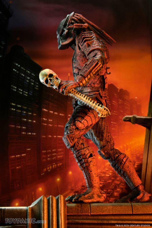 Celebrate the 35th anniversary of Predator 2 with this City Hunter Predator action figure from NECA’s Poster Series line! Inspired by the theatrical poster from the infamous 1990 sequel, this Predator figure features intricate deco that brings the look of the original poster art to life. For the first time ever, this collectible comes with a skyscraper gargoyle base, where the Predator stealthily perches as he surveys Los Angeles on the hunt for his next worthy prey. Display it your way: mount it on the wall using the hole on the back of the base or showcase it with the included stand for shelf display. Accessories include alternate interchangeable hands, a spear, and a skull with spine. Packaged in a deluxe, poster-style window box, the 7-inch scale figure is posed to perfectly replicate the film’s unforgettable poster art.