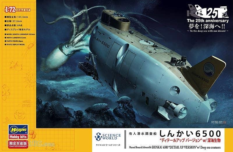 The Shinkai 6500 deep-submergence vehicle was completed in 1990. It's notable for having a depth range of 21,300 feet (6,500 m), far surpassing the range of most manned research vehicles all over the world. Launched from the Yokosuka, the Shinkai 6500 has been used on over 1,250 operations in just over 20 years. This limited edition kit features photo-etched sample basket parts, parts for one giant squid and one giant isopod, plus two marking options.